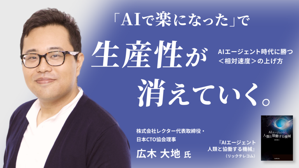 複数の立場から見る、変革の最前線 ――本日はお忙しい中、お時間をいただきありがとうございます。まず、広木さんの現在の活動について教えていただけますか。 よろしくお願いします。私は現在、株式会社レクターの代表として、また日 … 続きを読む 「AIで楽になった」で生産性が消えていく。AIエージェント時代に勝つ<相対速度>の上げ方——広木大地氏インタビュー