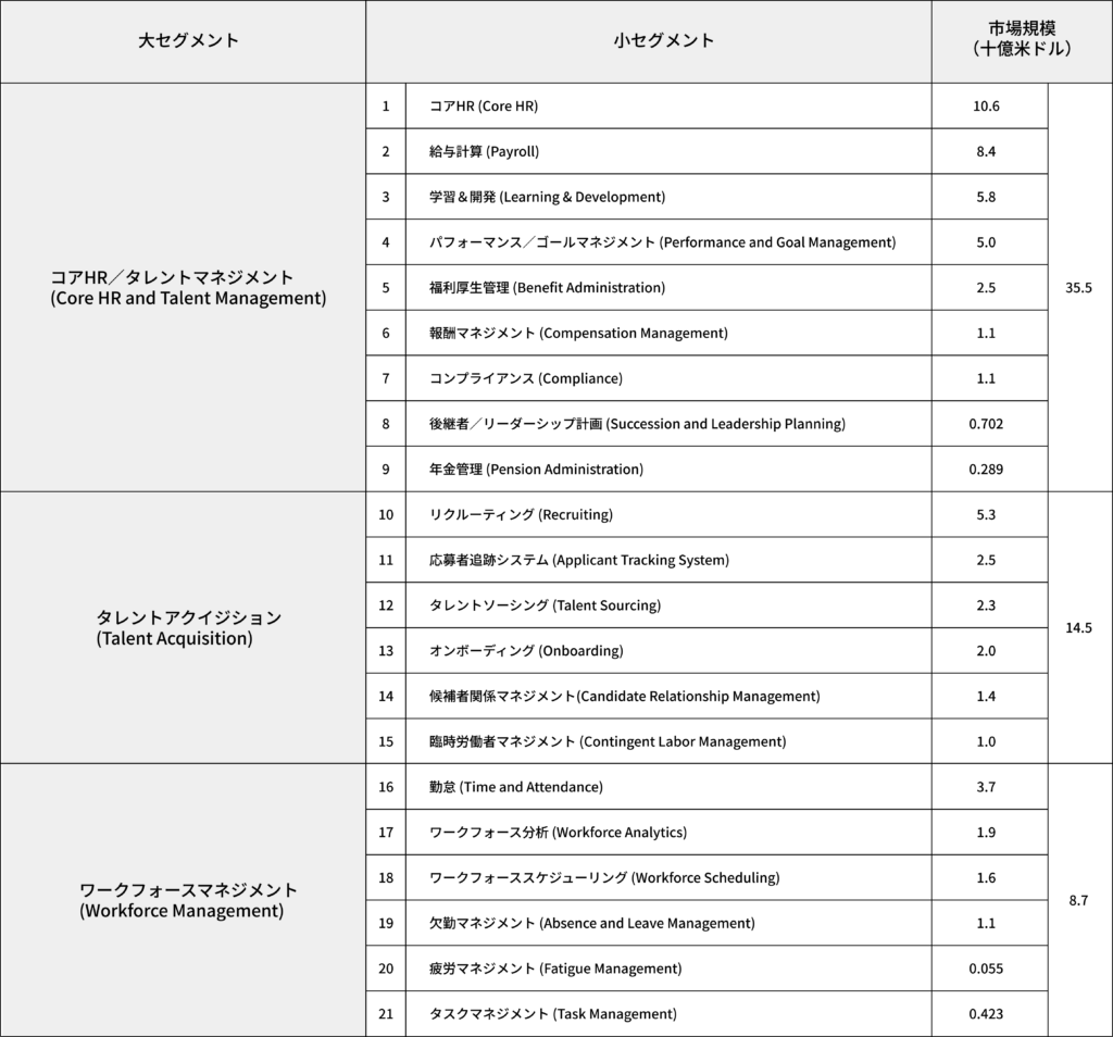 Apps Run The World社はHCMアプリケーション市場を3つの大セグメントと19の小セグメントに分けており、各セグメントの2024年の市場規模を図表2に示す。大セグメント別での市場規模は以下となった。