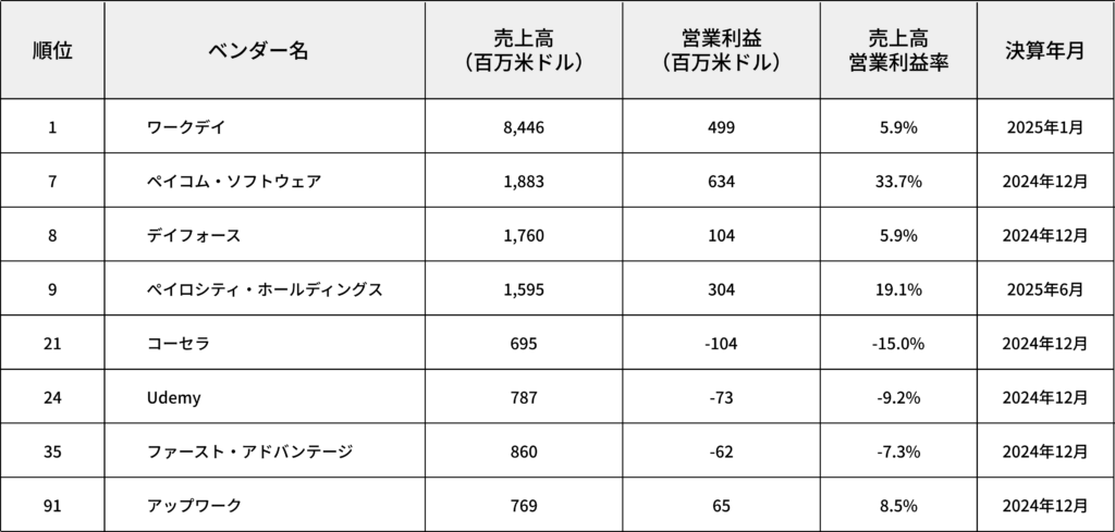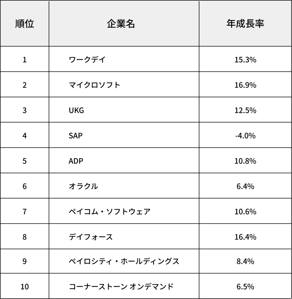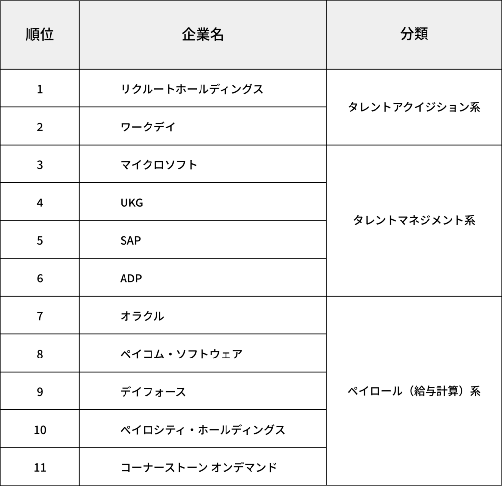 ・コアHR/TMで上位10社に入っている:2社(コーナーストーン オンデマンド、ペイチェックス)