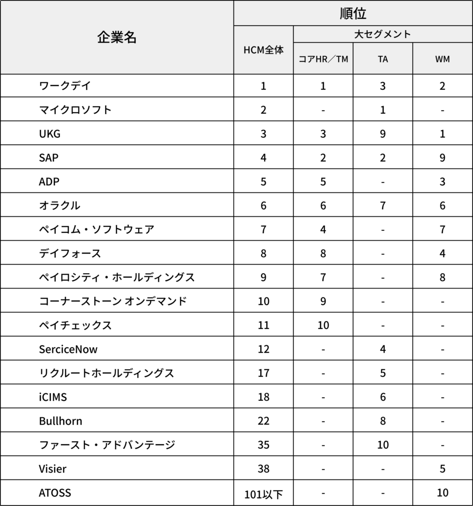 ・3つの大セグメント全てで上位10社に入っている:4社(ワークデイ、UKG、SAP、オラクル)