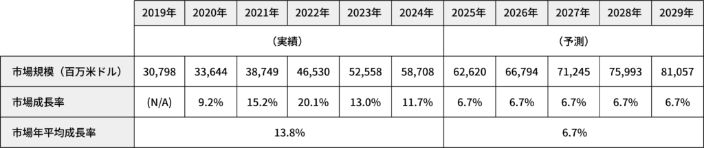 図表1にApps Run The World社が公表している情報を元に作成したHCMアプリケーションの世界市場規模推移を示す。2024年の市場規模は約587.08億米ドルであり、1米ドル=150円で換算すると約8兆8,000億円となる。Apps Run The World社の調査には、インターネットを活用した求人メディアや求人検索エンジンなど、事業規模が大きい一部のアプリケーションが含まれておらず、これらを含めると10兆円は優に超える市場規模となる。2019年から2024年の市場規模の年平均成長率は13.8%と高成長率の市場であり、2025年以降も年平均6.7%で成長することが予測されている。