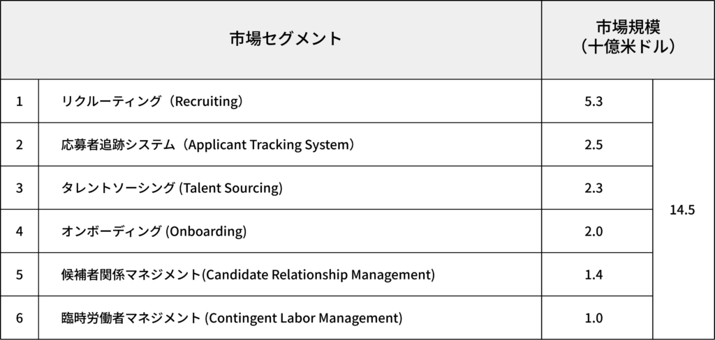 図表2にTA領域の市場セグメント毎のHCMアプリケーション2024年世界市場規模を示す。Apps Run The World社ではTA領域を6つの市場セグメントに分けているが、実際は更に細かく分けることができる。TA領域の市場を専門に調査をしているTalent Tech Labs社は、2024年のTA領域のHCMアプリケーション市場を40の市場セグメントに分けている。従って、図表2の6つの市場セグメントも実際にはさらに細かく分かれるため、同じ市場セグメントのHCMアプリケーションベンダーでも競合関係にないことも多い。
