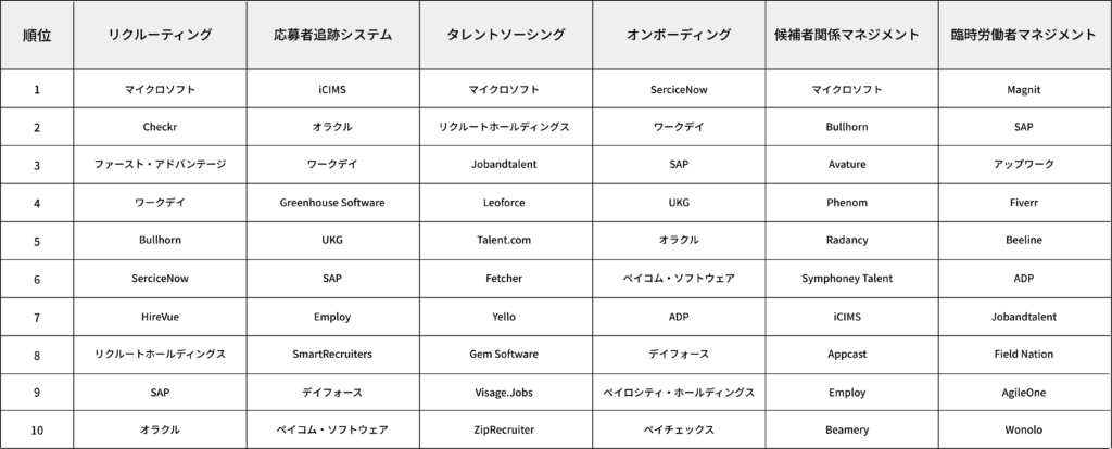 • タレントマネジメント系のSAP、ワークデイ、ServiceNow、オラクルは、リクルーティング、オンボーディング、応募者追跡システムをカバー。
