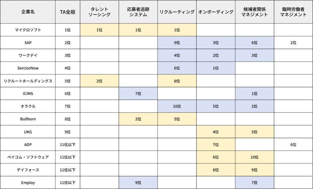 図表3にTA領域の各市場セグメントの2024年世界売上高上位10社を示す。企業名については、日本語表記が存在する企業は日本語で、日本語表記が存在しない企業は英語で表記した。TA領域の市場の特徴としては、複数の市場セグメントで上位10社に入っているHCMアプリケーションベンダー(計13社)と、特化した市場セグメントで上位10社に入っているHCMアプリケーションベンダー(計29社)に分けられる。つまり、TA領域においても、統合化に向かっているHCMアプリケーションベンダーと、特にスタートアップ企業に多いが、市場セグメントを特化して差別化を図るHCMアプリケーションベンダーに分けられる。